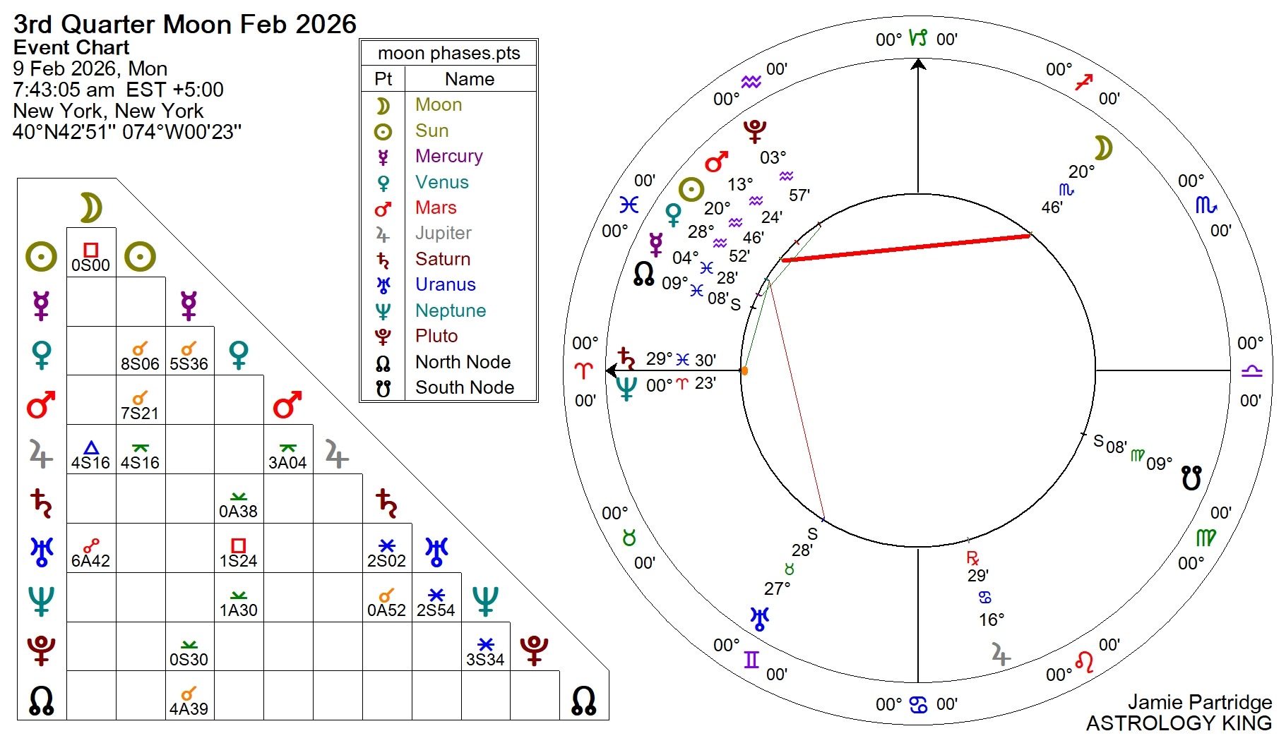 | Feb 09 | 07:43 | 3rd Quarter Moon Feb 2026 | 20♏46 |