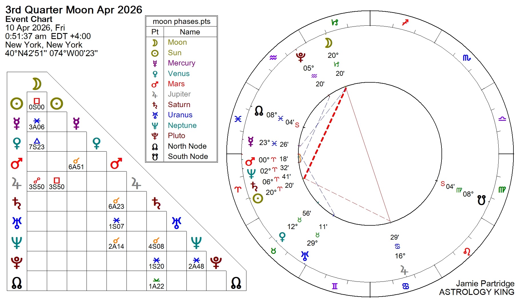 | Apr 10 | 00:51 | 3rd Quarter Moon Apr 2026 | 20♑20 |