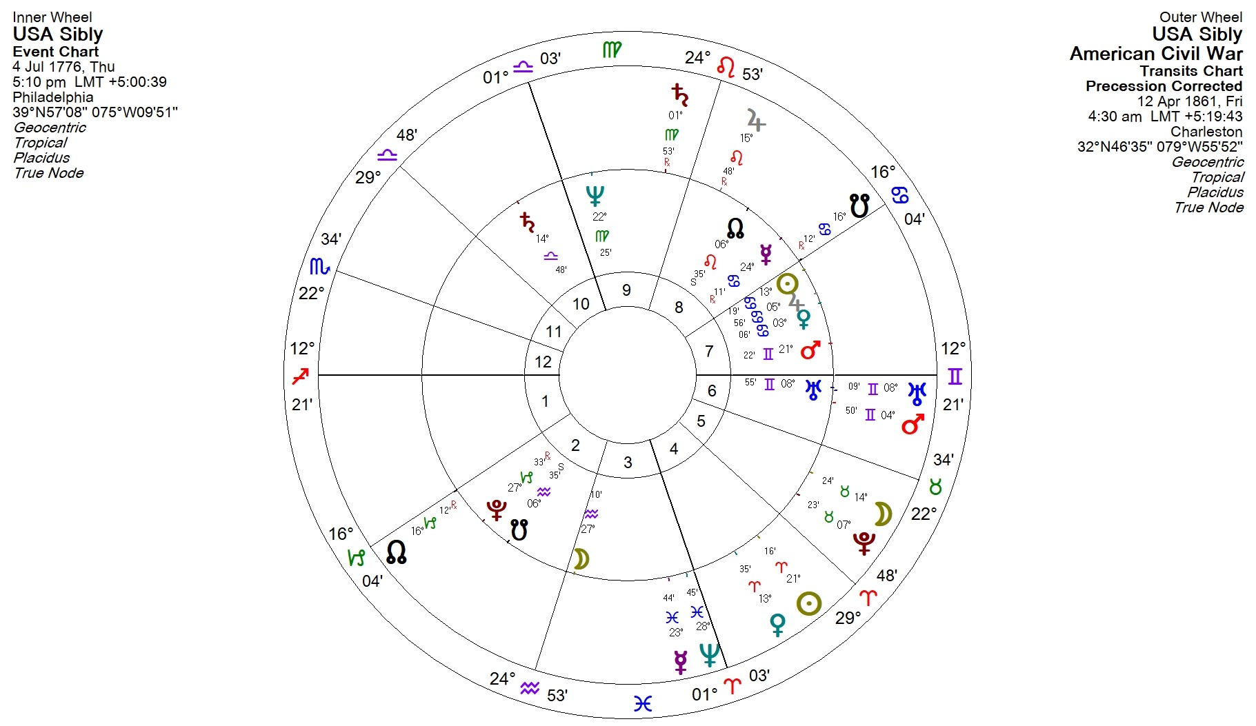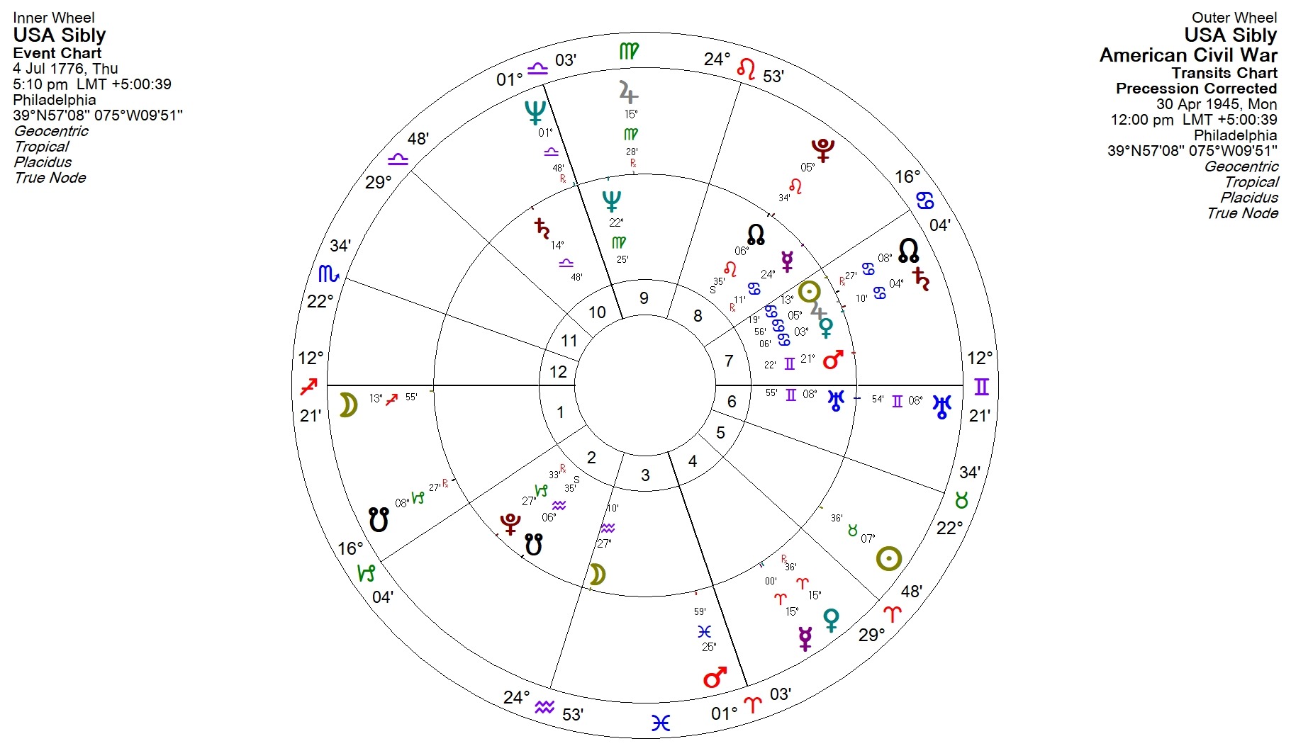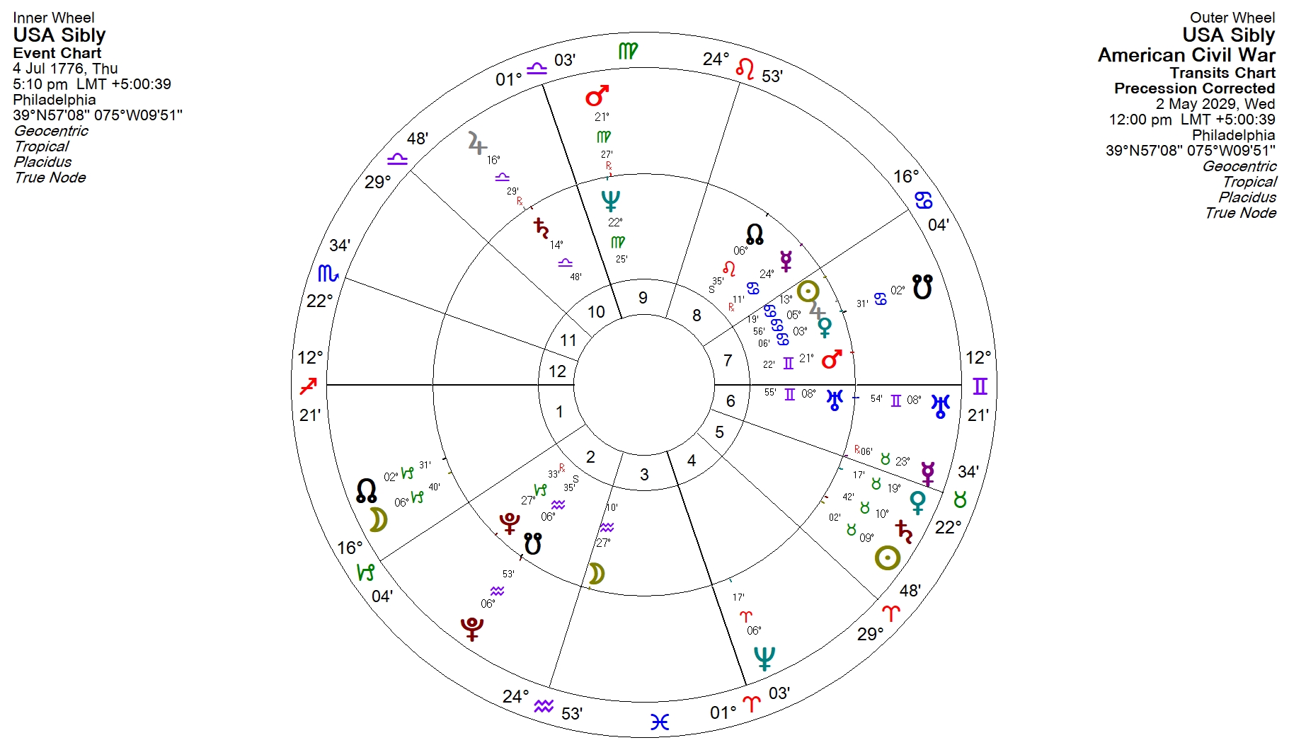 The Uranus return from 2028 to 2029 indicates a major war affecting the U.S.A. The differences between the Neptune and Pluto transits suggest the likelihood of American Civil War II, or possible defeat in World War III.