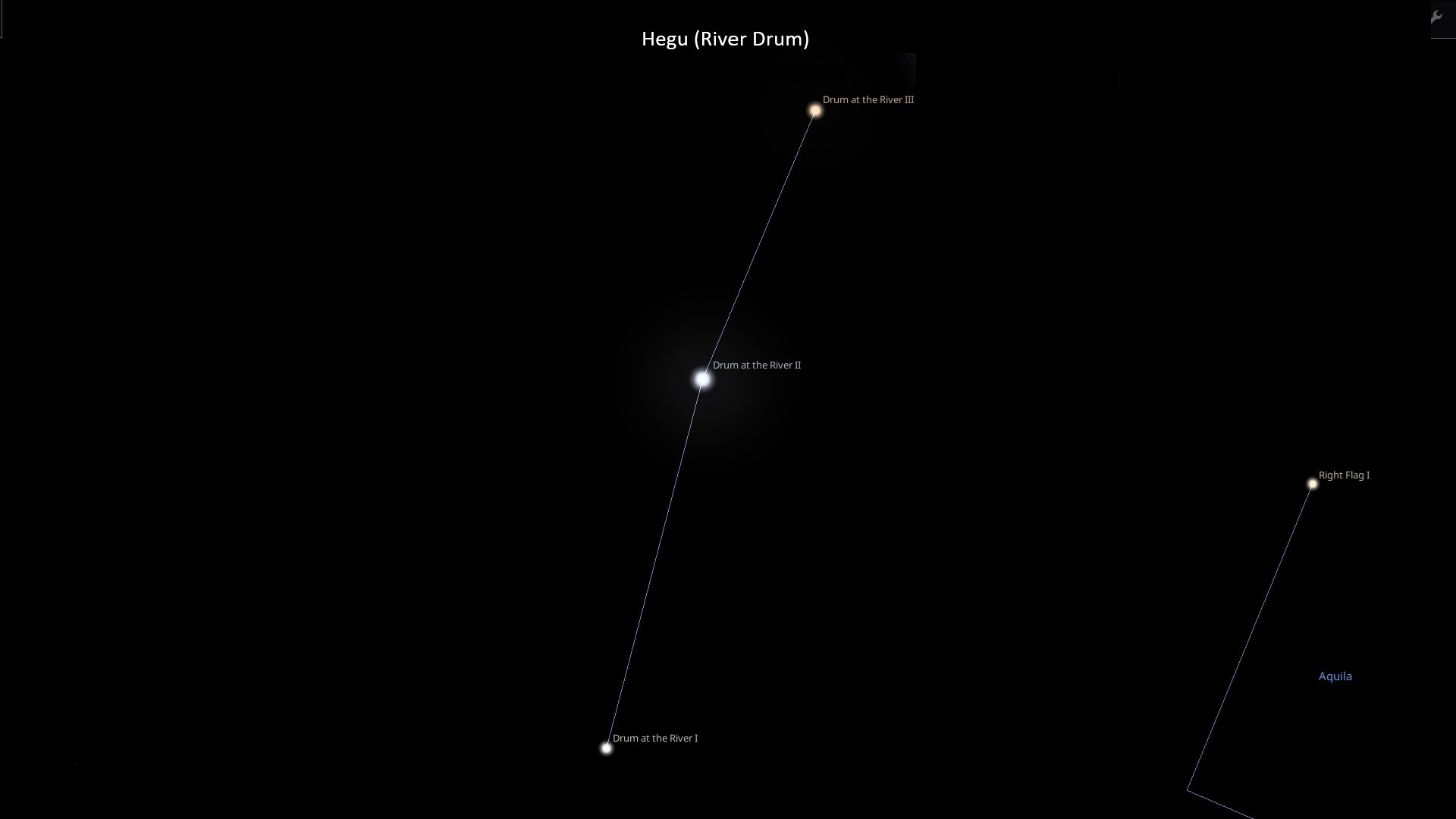 The fourth asterism of the Ox Mansion is also called 河鼓 Hegu, “River Drum.” It represents the Drums of the Heavenly Army and is composed of three stars of the Aquila constellation. [1]