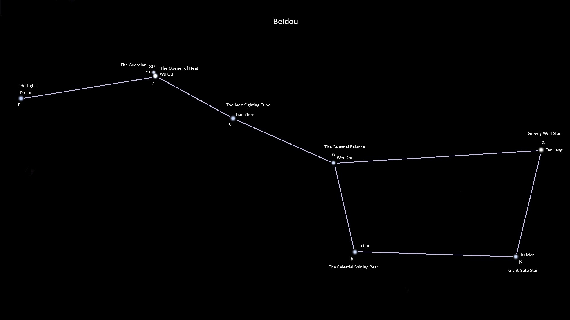 In ancient Chinese astronomy and modern Chinese astrology, the Big Dipper is known as Beidou, “Northern Dipper.” It is the arbiter of the order of heaven and earth, and the seasons of spring, summer, autumn, and winter all follow its direction. The rotation and direction of the Big Dipper’s handle served as a basis for dividing the days and years on Earth, to determine the Doujian, the twelve lunar months, and to provide a timely guide for agricultural production.