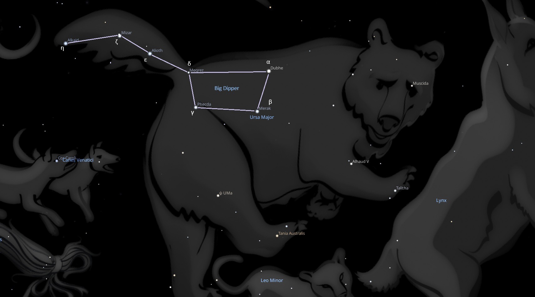 The Big Dipper depicts a ladle, with the bright stars on the tail of the Big Bear forming the handle, while those on the back make up the bowl. The handle and the bowl meet at Delta Ursae Majoris (δ UMa), also known as Megrez.