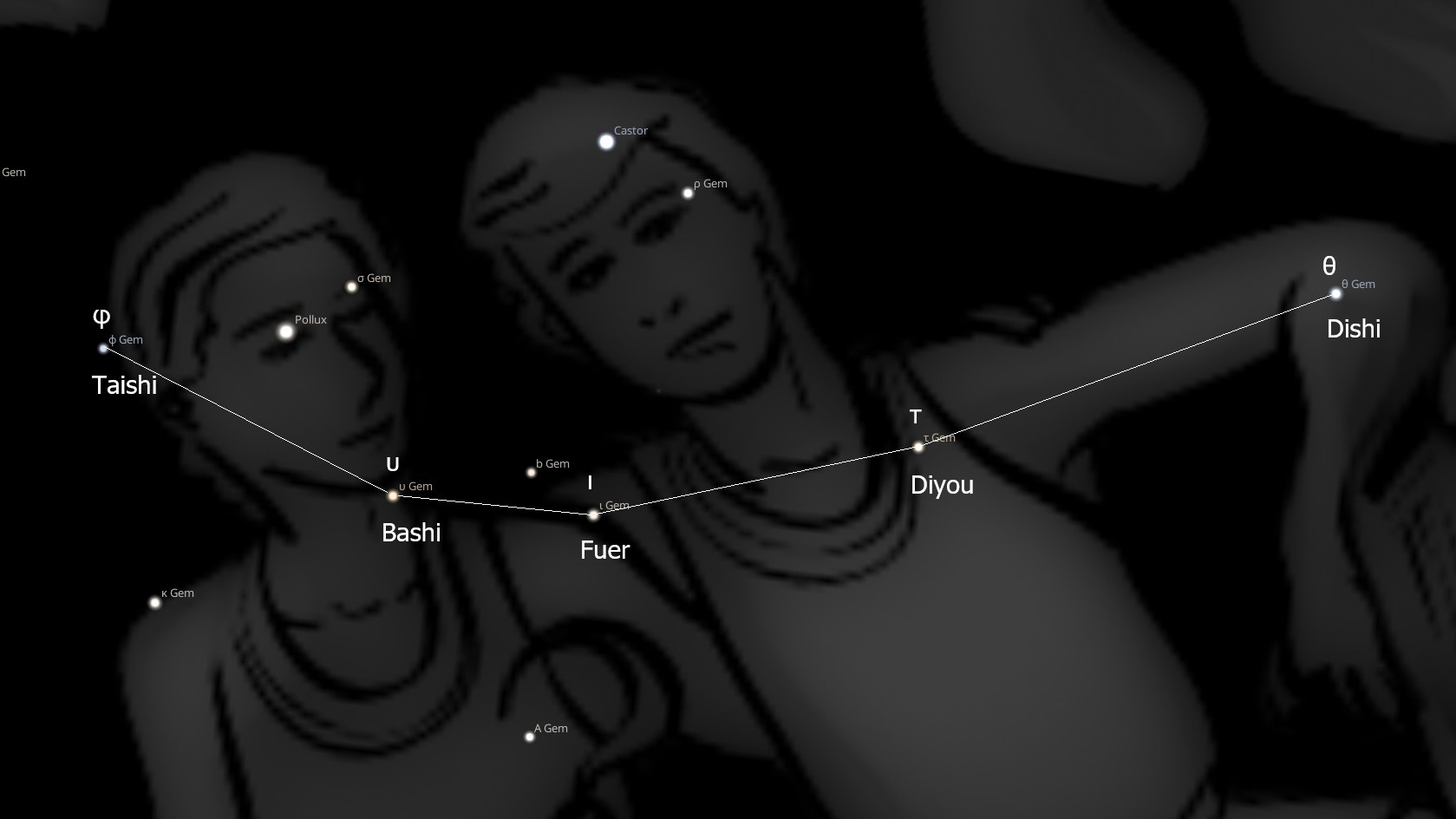 2. τ Gem – Dìyǒu, Imperial Friend. Symbolizes military preparedness.