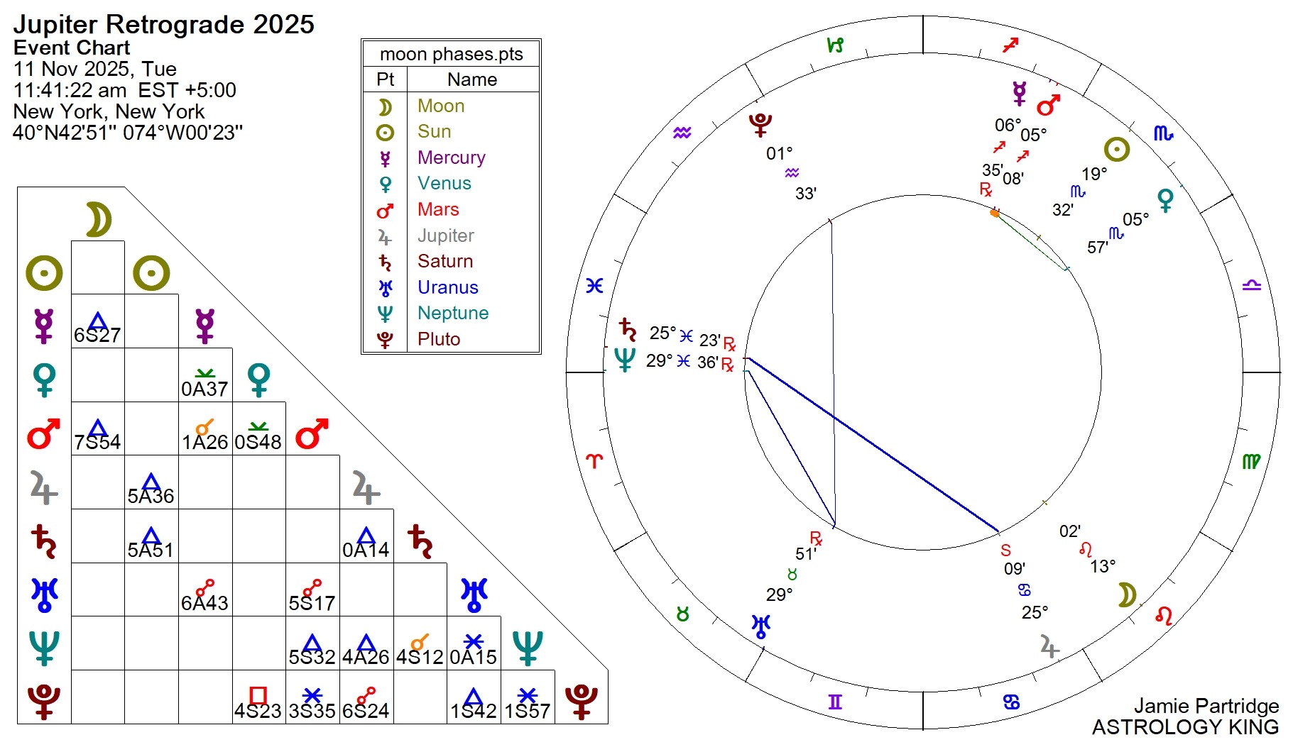 Jupiter stations retrograde at 25°09′ Cancer on November 11, 2025. It makes the harmonious trine aspect to Saturn. However, Saturn is also retrograde, and both planets align with challenging fixed stars.
