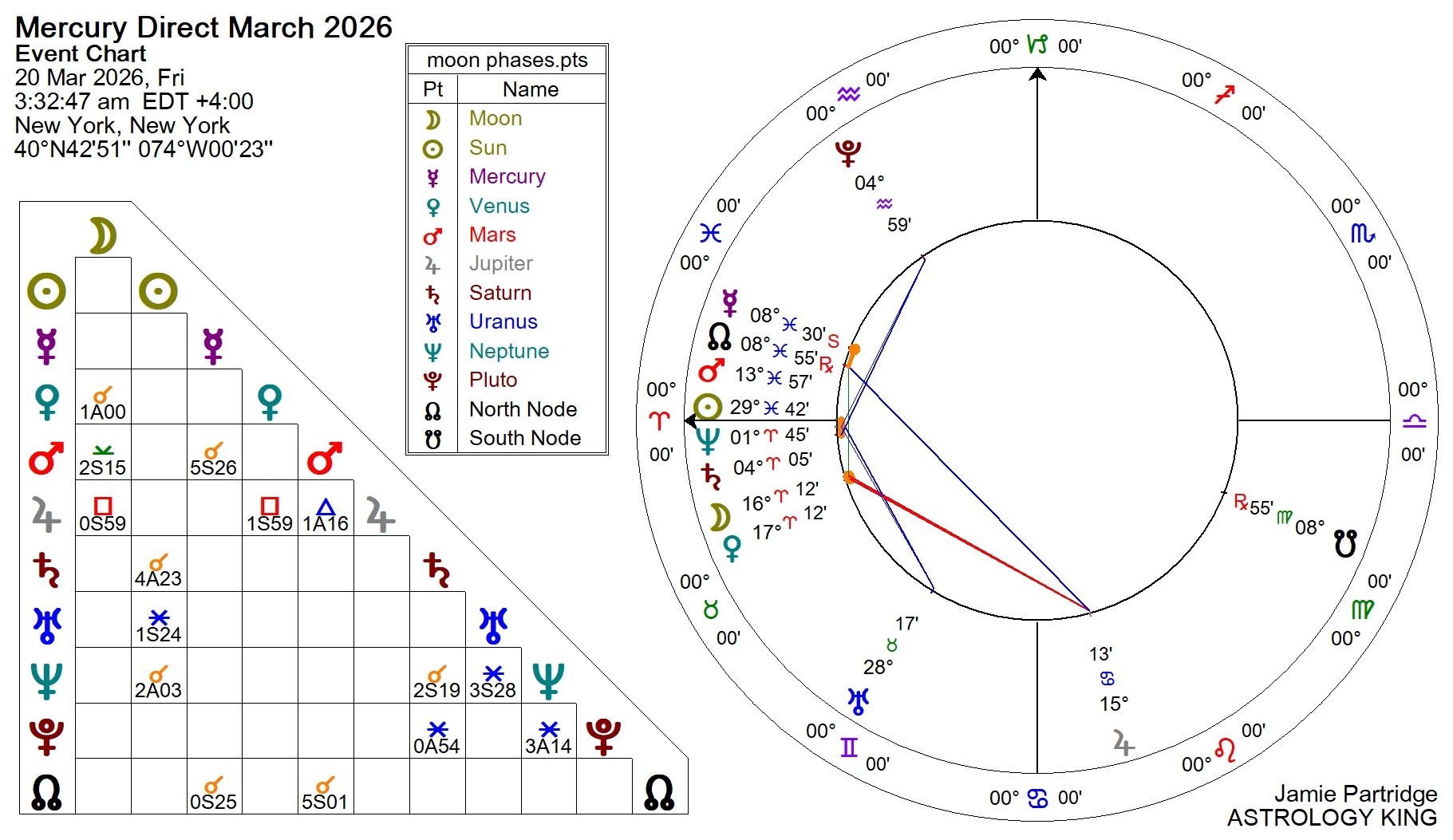 The chart below is for Mercury stationary retrograde. Mercury conjunct Venus is the only direct aspect, and it stays within a three-degree orb from February 25 to March 1.