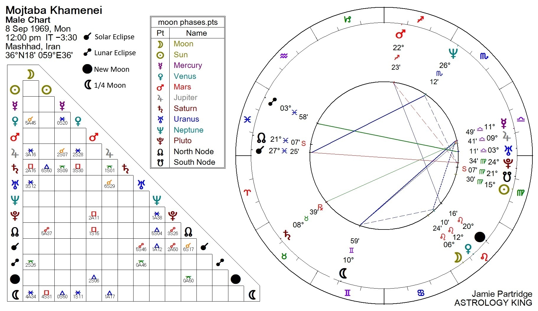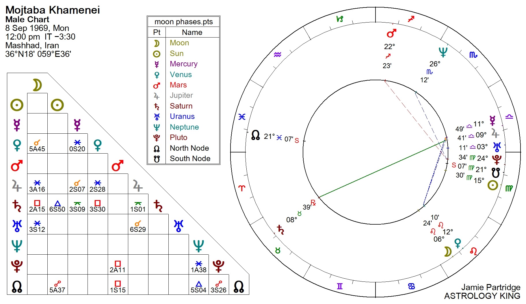 The following Mojtaba Khamenei horoscope includes the prenatal lunations, which can give clues to his karmic mission.