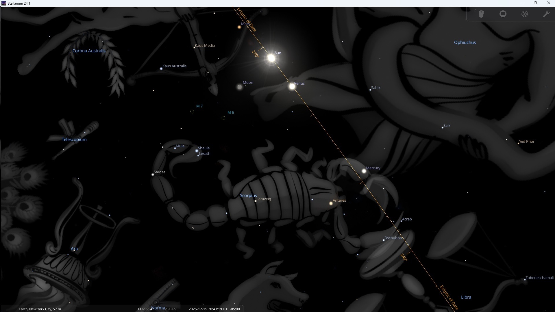 The December 2025 new moon is at 28 degrees in the Sign of Sagittarius. But because of the precession of the equinoxes, it is in the Constellation of Scorpius. More specifically, it aligns with the Sting of the Scorpion and the Right Eye of the Dragon.