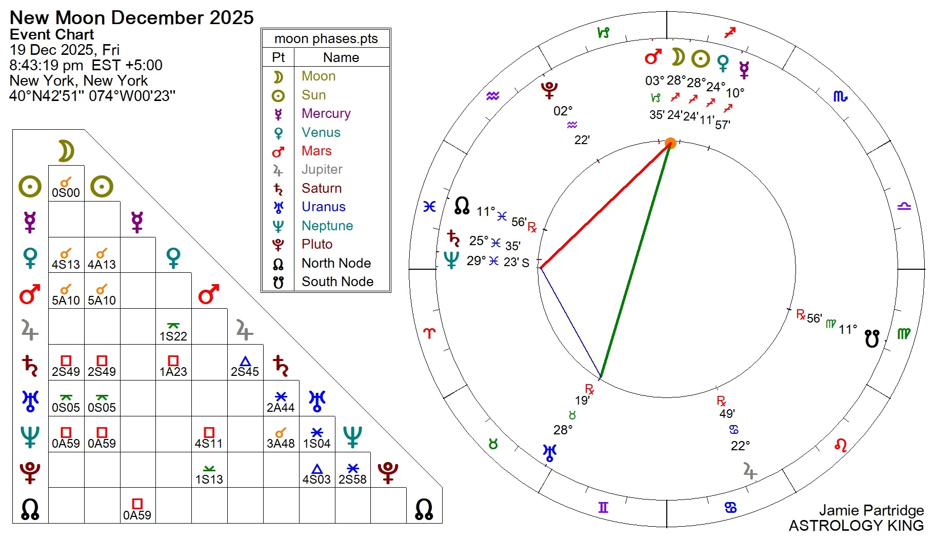The new moon on December 19, 2025, is at 28°24′ Sagittarius. It lies between Venus and Mars, but the most critical aspects are highlighted in the chart below. Both are challenging aspects: the red square to Neptune and the green quincunx to Uranus.