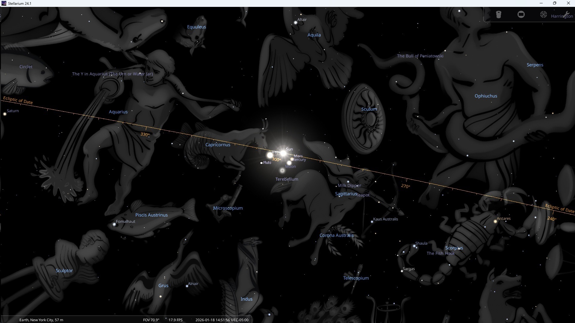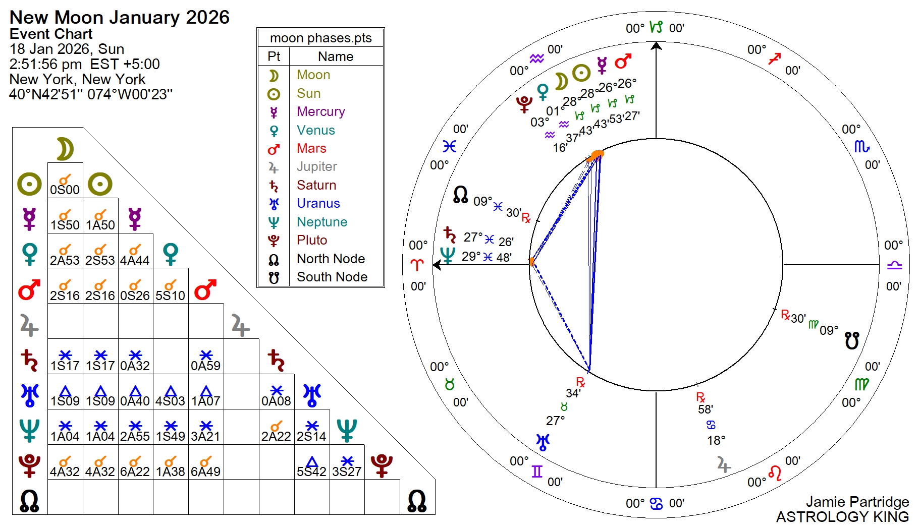 The new moon on January 18, 2026, is at 28°43′ Capicorn. It forms a Stellium (a grouping of three or more planets) with Mercury, Venus, Mars, and Pluto.