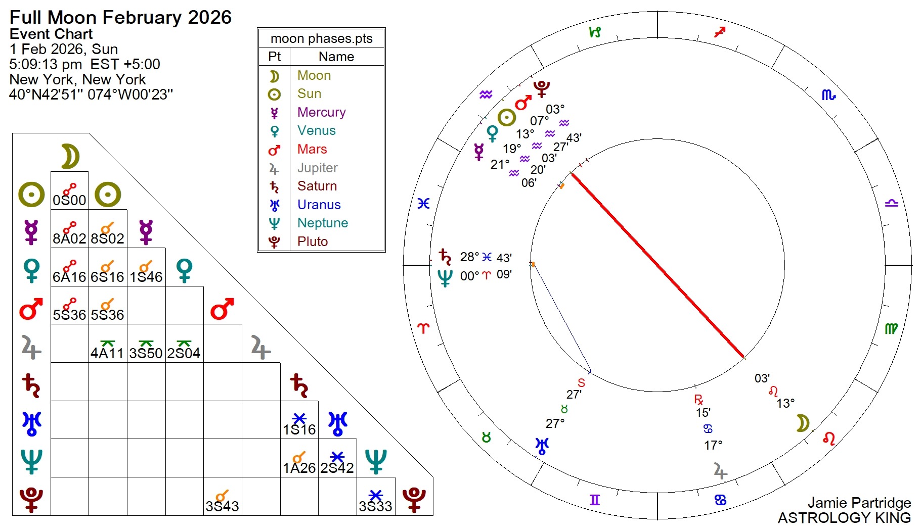- Feb 01, 05:09 pm – Full Moon February 2026 at 13♌04